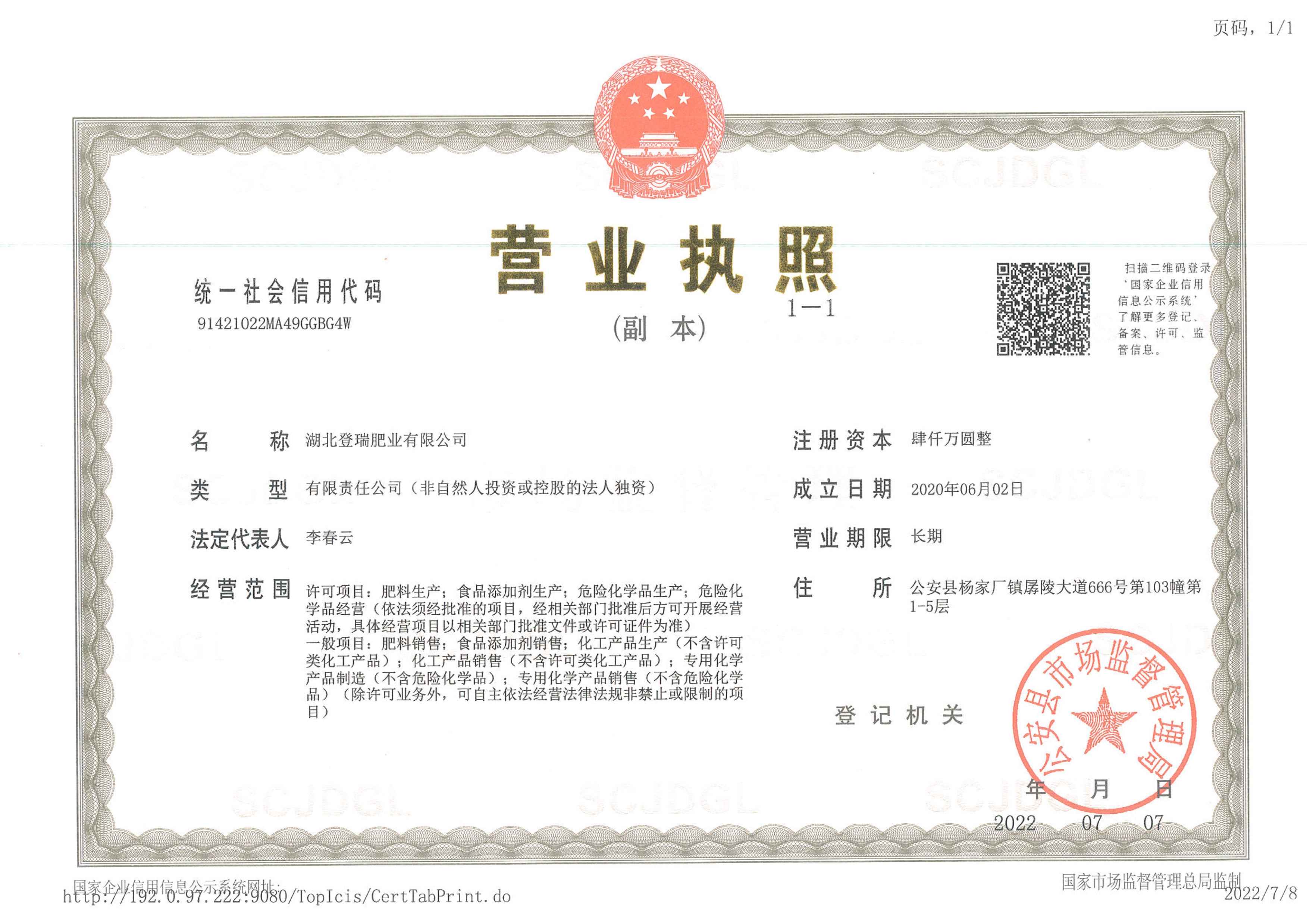 湖北登瑞肥业有限公司-营业执照